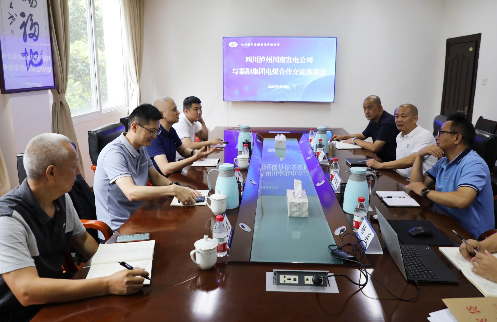 7月10日,瀘州川南發電公司黨委副書記、總經理陳嵩,副總經理文曉春一行到嘉陽交流電煤合作事宜,集團公司黨委副書記、總經理范勤英與陳嵩一行進行了積極有效溝通,達成了合作共識。