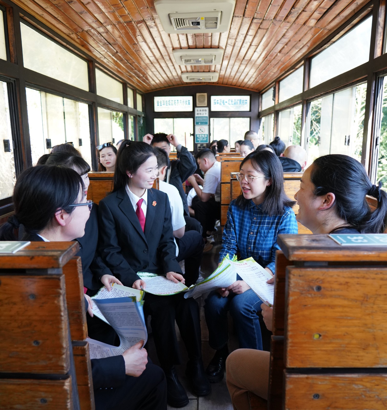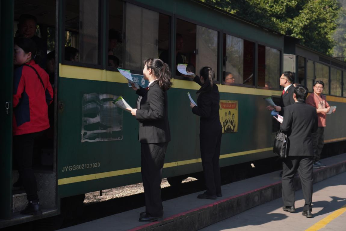 活動當天,法官們登上嘉陽小火車,將車廂變為“移動普法課堂”,結合《環境保護法》《民法典》中生態環境侵權責任條款,隨著火車徐徐前進,向游客們講解環境污染防治、生態破壞法律責任等法律知識,并發放圖文并茂的普法宣傳冊。
