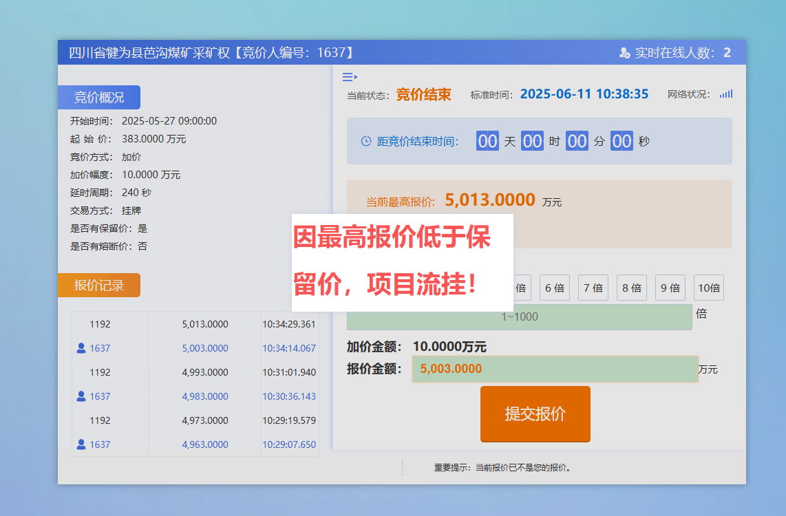 6月11日上午10點30分,四川省自然資源廳對四川省犍為縣芭溝煤礦采礦權進行了網絡交易平臺競拍,經過20余輪激烈競拍,最終因最高報價低于保留價,項目流掛。目前,資源仍屬于國家所有,預計自然資源廳將重新出讓。屆時,公司仍將積極參與競拍,力爭獲取礦權。