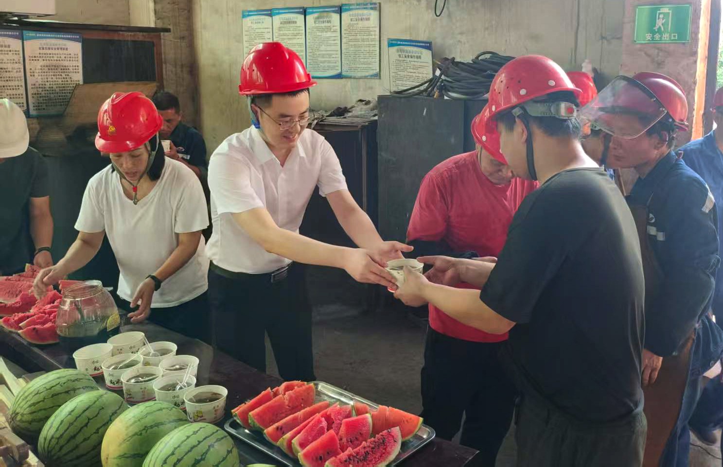 機關第四黨支部分別前往宜賓福溪粉煤灰公司和機電制造維修分公司開展“送清涼、送安全、送祝福”活動。在福溪粉煤灰公司,黨委副書記、工會主席謝建國為高溫戰線的職工送上礦泉水和西瓜,叮囑大家注意個人防護,預防中暑。謝建國了解了粉煤灰公司安全生產等多方面的情況,提醒經營班子關注夏季高溫對職工的影響,加強與職工的溝通交流,及時為職工解難事、辦實事,確保職工隊伍穩定,助力平安度夏。