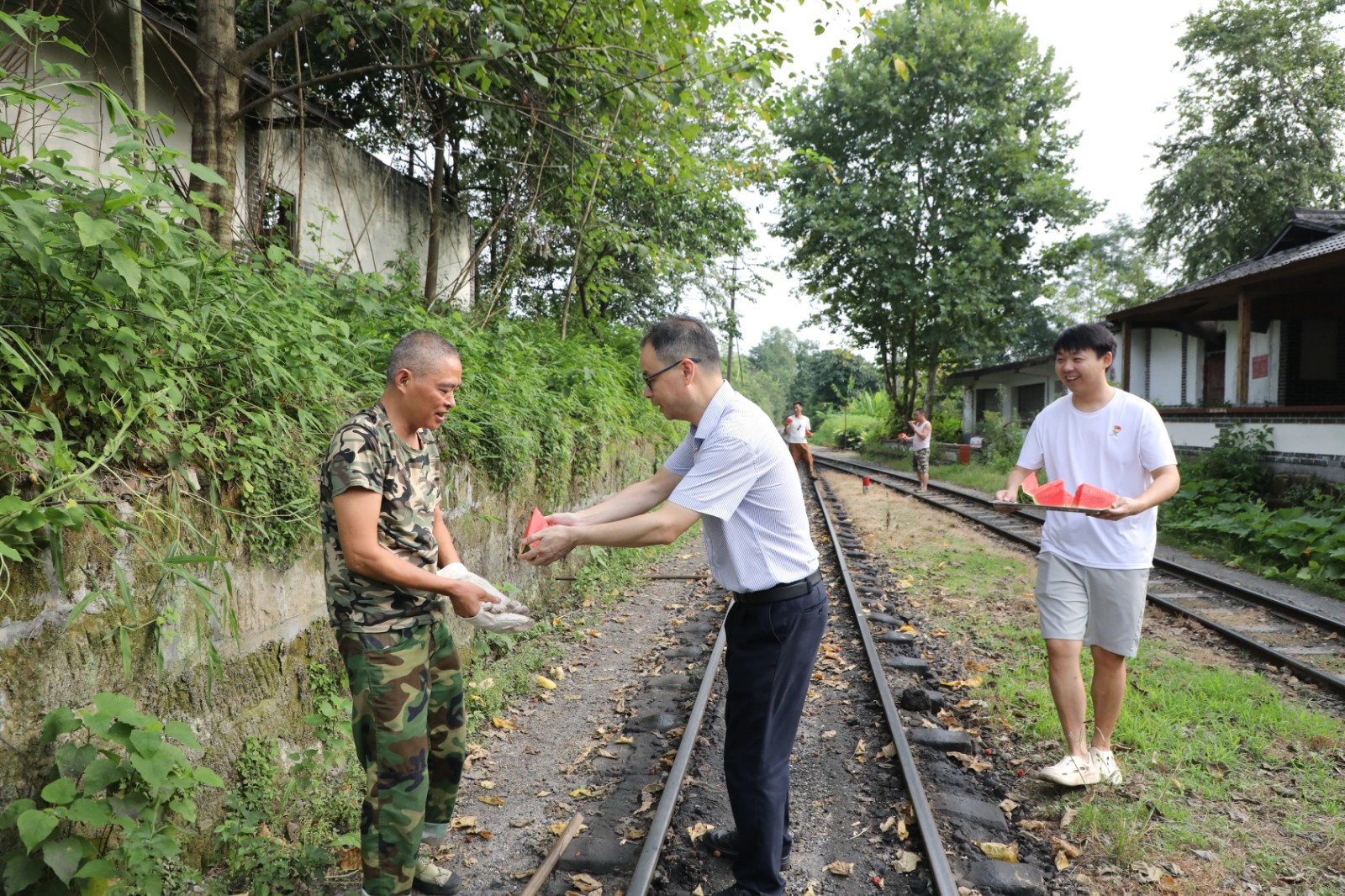 “兄弟們,把手中的活放一放,過來吃口西瓜涼快涼快……”,在火車機頭、在檢修車間、在芭石鐵路、在黃村井井口、在芭蕉溝花圃……紀委書記呂明強一邊招呼著火車司機、檢修工、道班維修工、講解員、花圃養護工……一邊將切好的西瓜送到他們手中。每到一處,呂明強認真了解他們的工作情況,仔細叮囑他們合理安排作息時間,盡可能避開高溫時段在烈日下工作,同時要準備好防暑藥品,落實好防暑措施,防止高溫中暑。