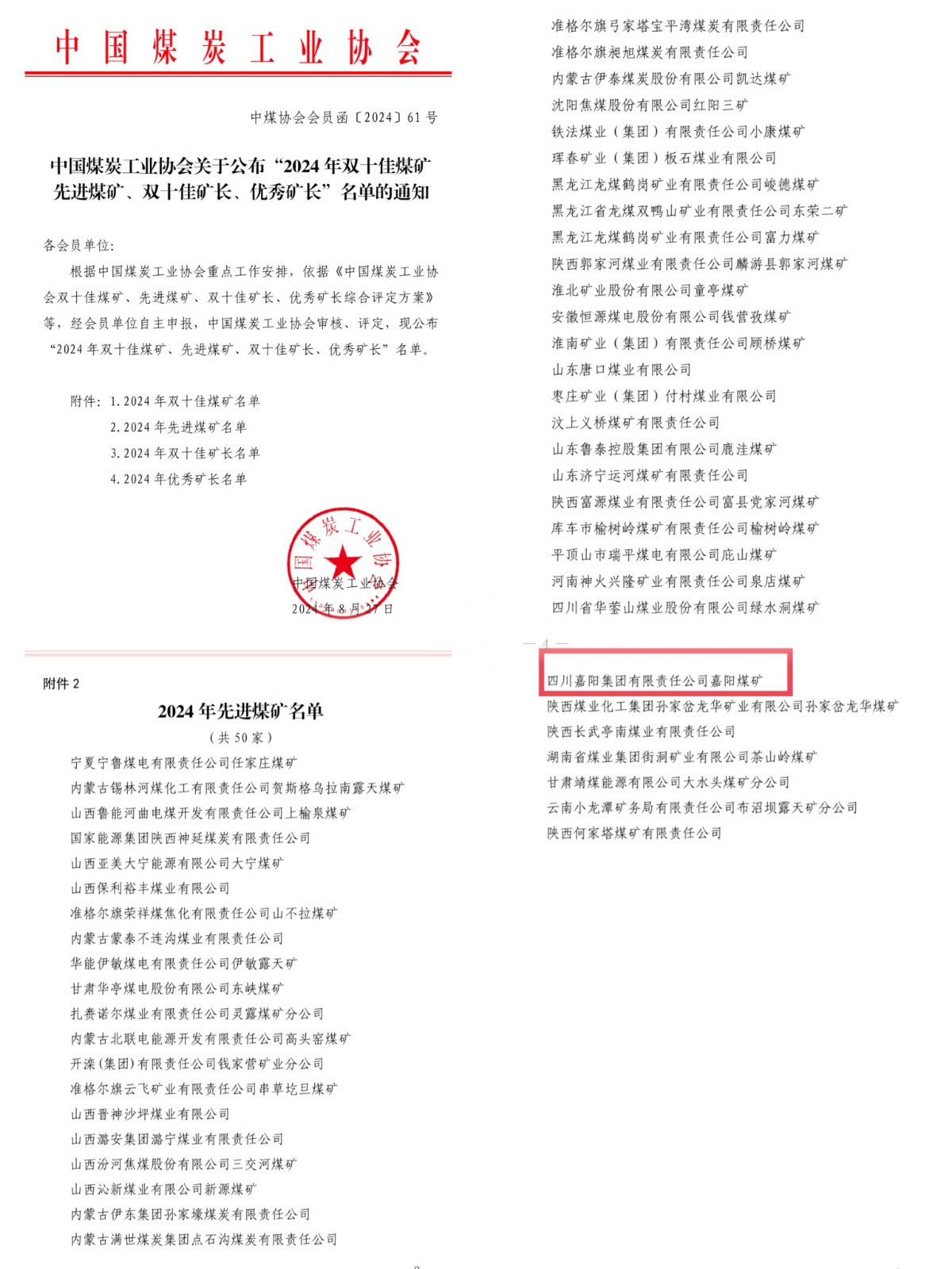 近日,中國煤炭工業協會公布了“2024年先進煤礦”評選結果,嘉陽煤礦憑借在安全生產、科技創新、經營管理等方面的突出表現,榮獲2024年度“先進煤礦”榮譽稱號。