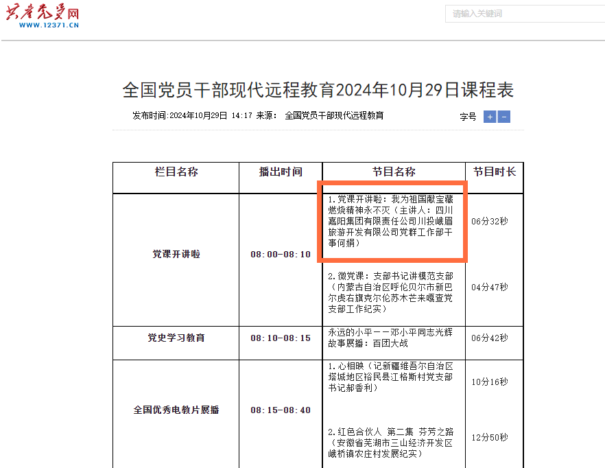 10月29日,由中共中央組織部主管、中央組織部黨員教育中心主辦的共產(chǎn)黨員網(wǎng)公布全國黨員干部現(xiàn)代遠(yuǎn)程教育課程表,集團(tuán)公司微堂課《我為祖國獻(xiàn)寶藏 燃燒精神永不滅》精彩亮相,用6分32秒的時長為全國的黨員們呈現(xiàn)了難忘的一課。