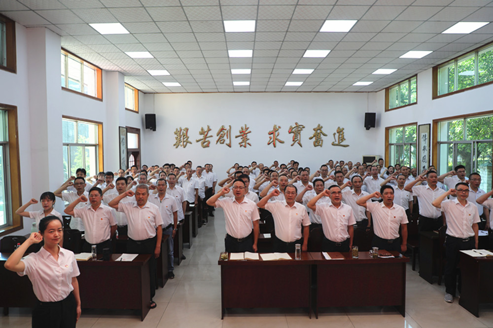 面對鮮紅的黨旗,100名共產(chǎn)黨員舉起右手,發(fā)出錚錚誓言,響亮的聲音在辦公樓久久回蕩。